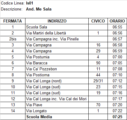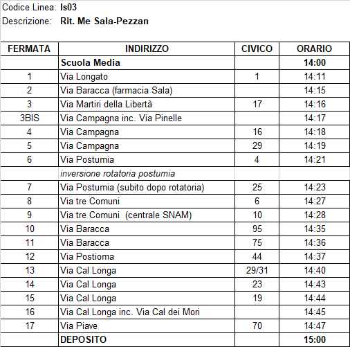 LINEA 1 - RITORNO MEDIE SALA / PEZZAN ore 14:00